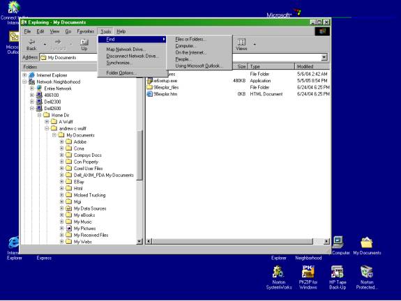 Please note we use the " > " symbol to mean Next ( a slide window comes up) Go to your Start menu click Programs > click on Windows Explorer. After Explorer opens go to the menu of explorer Click on tools > Click on Find, > Click on Files or Folders