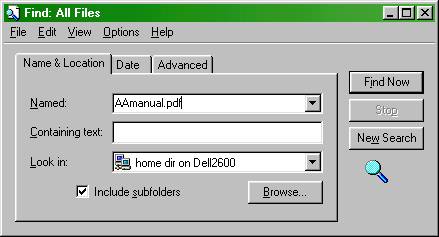 Type in the file name or part of the file name using wild cards in the Named box; In the Look in box select WHERE you want to look either your computer and it's drive or your companies network. final step is to click Find Now button